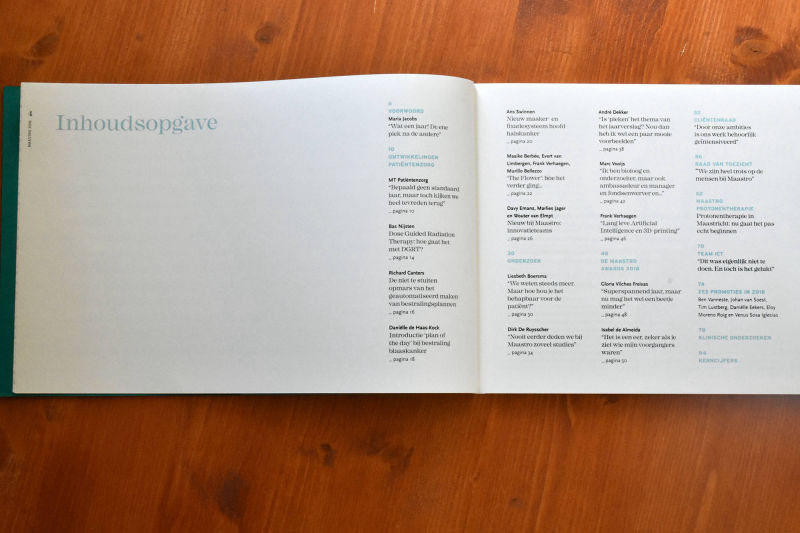 Sinds 2008 schrijf ik de jaarverslagen voor Maastro: het Limburgse instituut voor radiotherapie. Het zijn stuk voor stuk prachtige boekwerken geworden. Elk jaar met een nieuw thema dat we consequent in de tekst, in de fotografie en in de vormgeving doorvoeren. Denk aan thema’s als: Uniek, Idealen, Fier, Bouwen en - de meest recente – Pieken. Tientallen gesprekken leiden elk jaar opnieuw tot prachtige gebundelde verhalen. Over de nieuwste behandelingen van kanker, over wetenschappelijk onderzoek, over de toenemende technische ontwikkelingen, over slimme projecten en ambities. Maar vooral over de gedrevenheid en de betrokkenheid van de mensen die er werken.